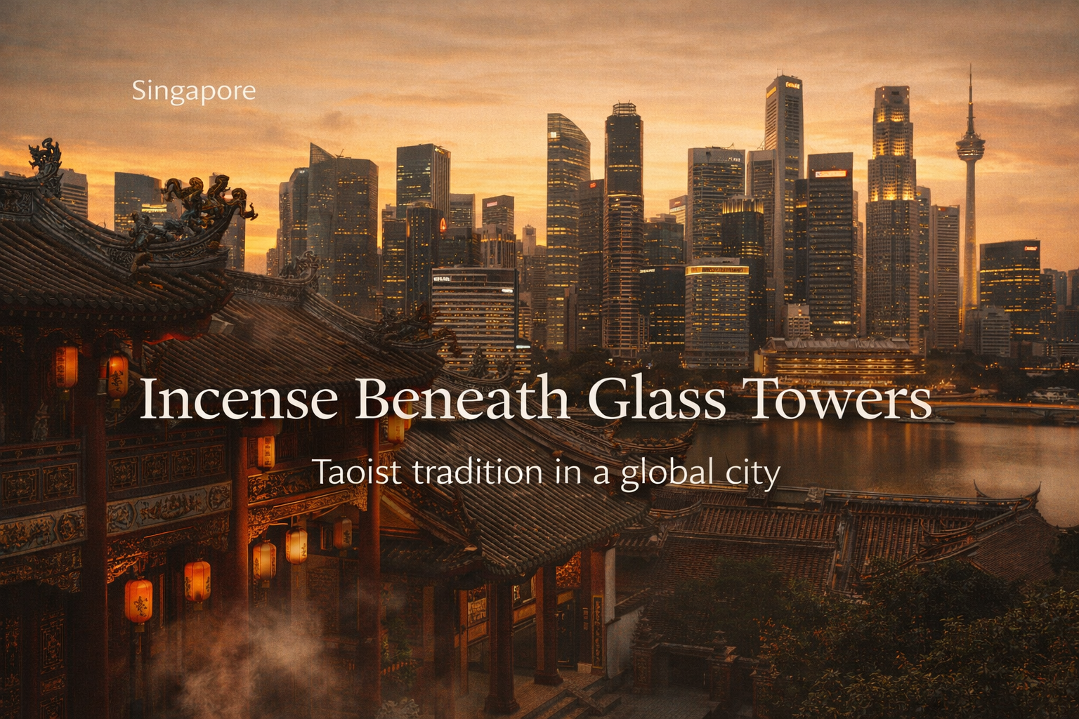 “In Singapore, incense rises beneath glass towers — ancient rhythm within a modern skyline.”